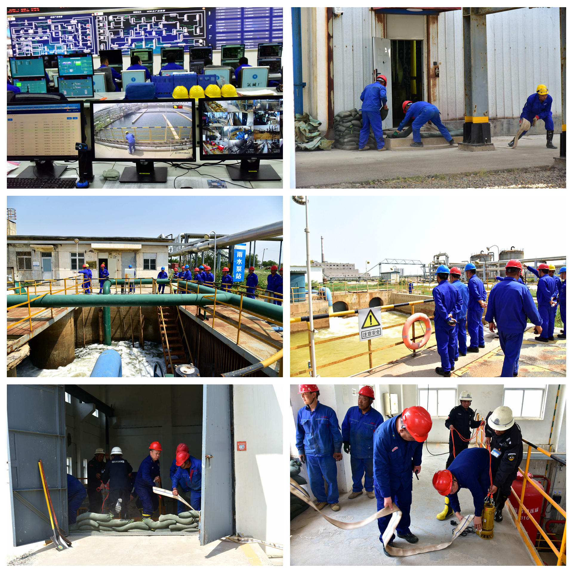 此次演練指揮部設(shè)在聚隆化工生產(chǎn)調(diào)度指揮中心。演練模擬突發(fā)天氣,驟降暴雨,短時間內(nèi)廠區(qū)出現(xiàn)積水并逐漸漫延。
